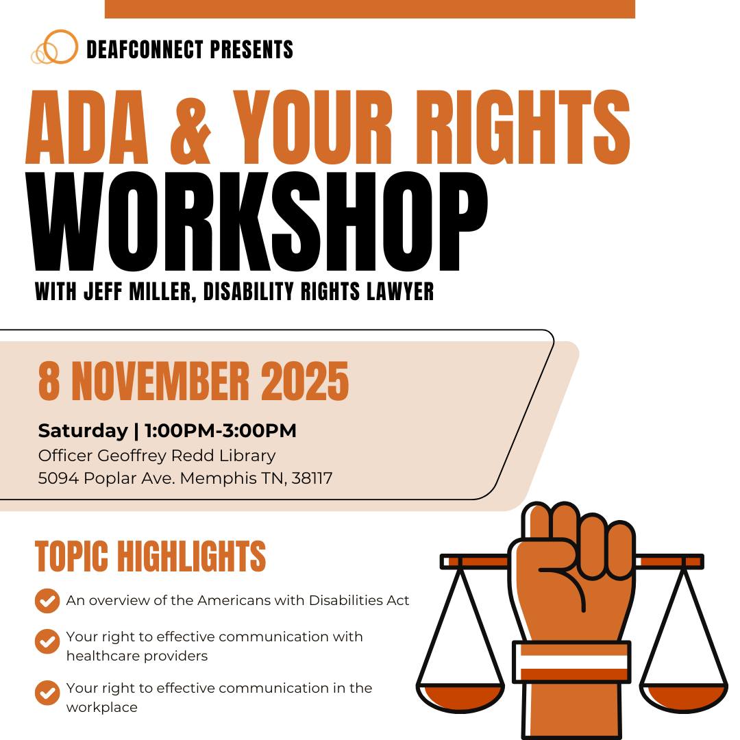 Join us Saturday, November 8th for a special workshop on disability rights with Jeff Miller, Assistant Professor of Law and Director of the Disability Rights Law Clinic at the University of Memphis School of Law. Jeff is a SODA (Sibling of Deaf Adult) and has represented Deaf clients in cases involving healthcare and workplace communication rights. He’ll cover: