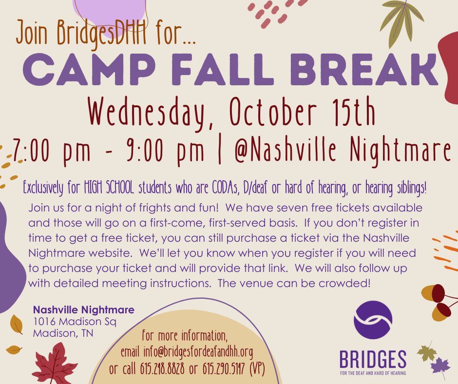 It is hard to believe that Fall Break for Metro Nashville Public Schools is right around the corner! The school year is flying by, isn't it? BridgesTN has three events set for your kiddos to enjoy during the break. On Wednesday, October 15th, high schoolers can spend a night of fright at Nashville Nightmares. We have a few free tickets for this event, but if you miss out on those you can still purchase tickets and attend with the group.