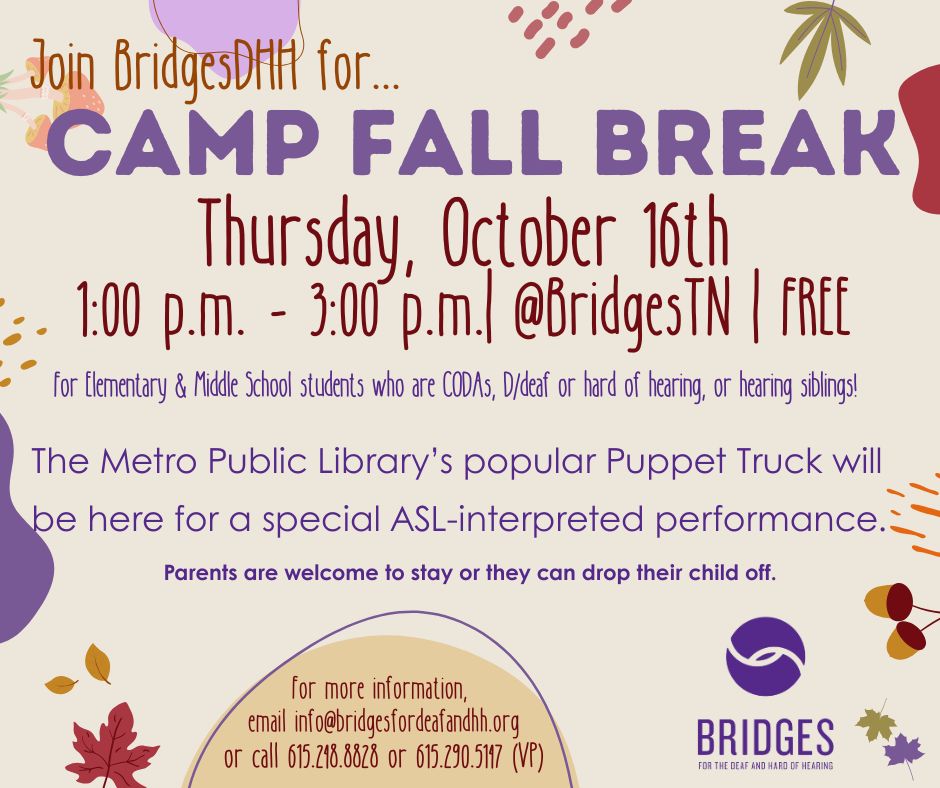 It is hard to believe that Fall Break for Metro Nashville Public Schools is right around the corner! The school year is flying by, isn't it? BridgesTN has three events set for your kiddos to enjoy during the break. On Thursday, October 16th, we have the Nashville Public Library's Puppet Truck coming for an ASL interpreted show! This event is free.
