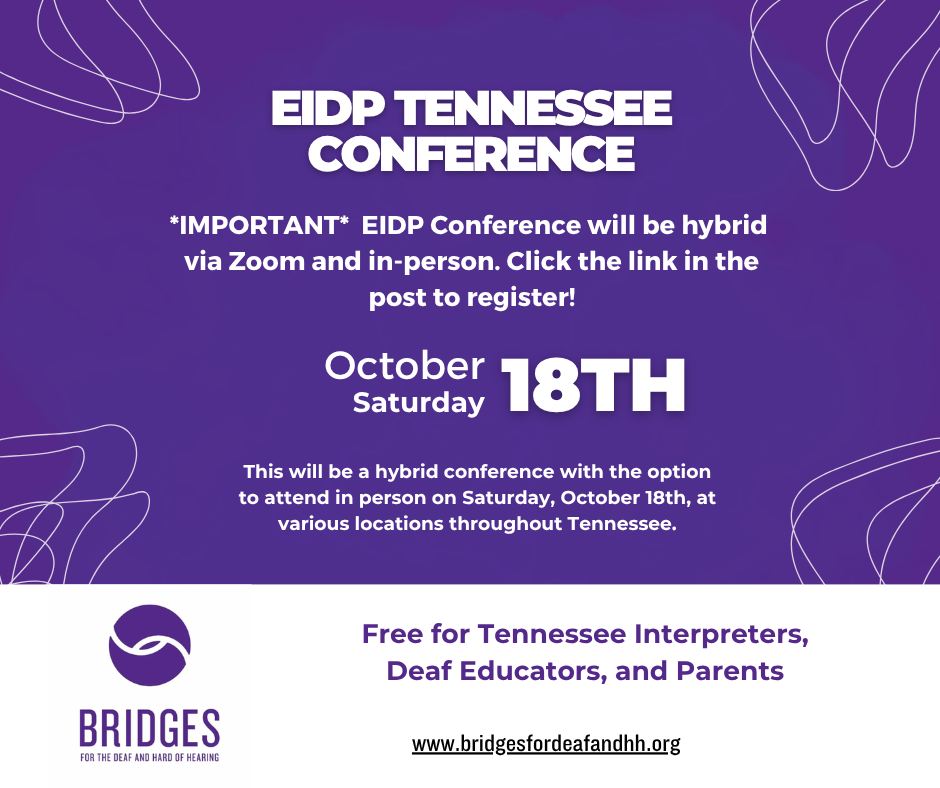 FREE for Tennessee interpreters, Deaf Educators, and parents, the annual Deaf Education Conference, hosted by Bridges for Deaf and Hard of Hearing's Educational Interpreter Development Program, is set for Saturday, October 18th! The event will be hybrid - offered virtually and at four locations across the state if you prefer to attend in-person! Please click here for more information or to register: https://form.jotform.com/250574671182156