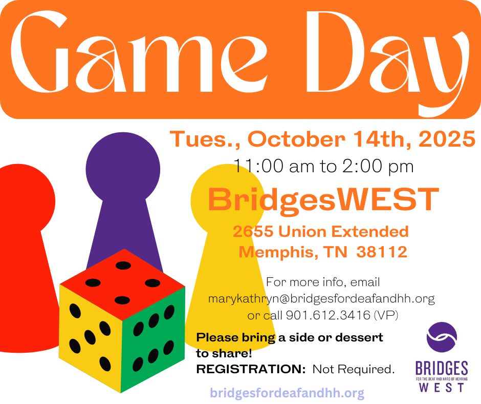 BridgesWEST will host monthly Game Day at their place. Bring a side or dessert to share! Registration is not required.