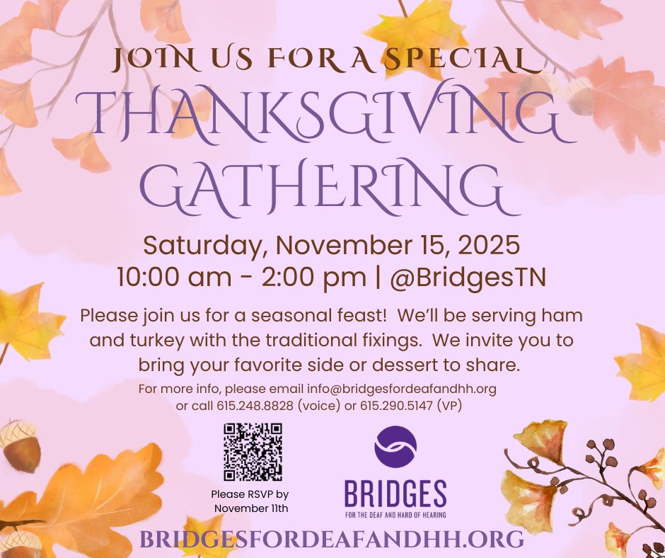 Join BridgesTN for a Thanksgiving gathering and feast on November 15th from 10am - 2pm. Register here and let us know if you have a favorite side or dessert to share: https://form.jotform.com/25273628253515