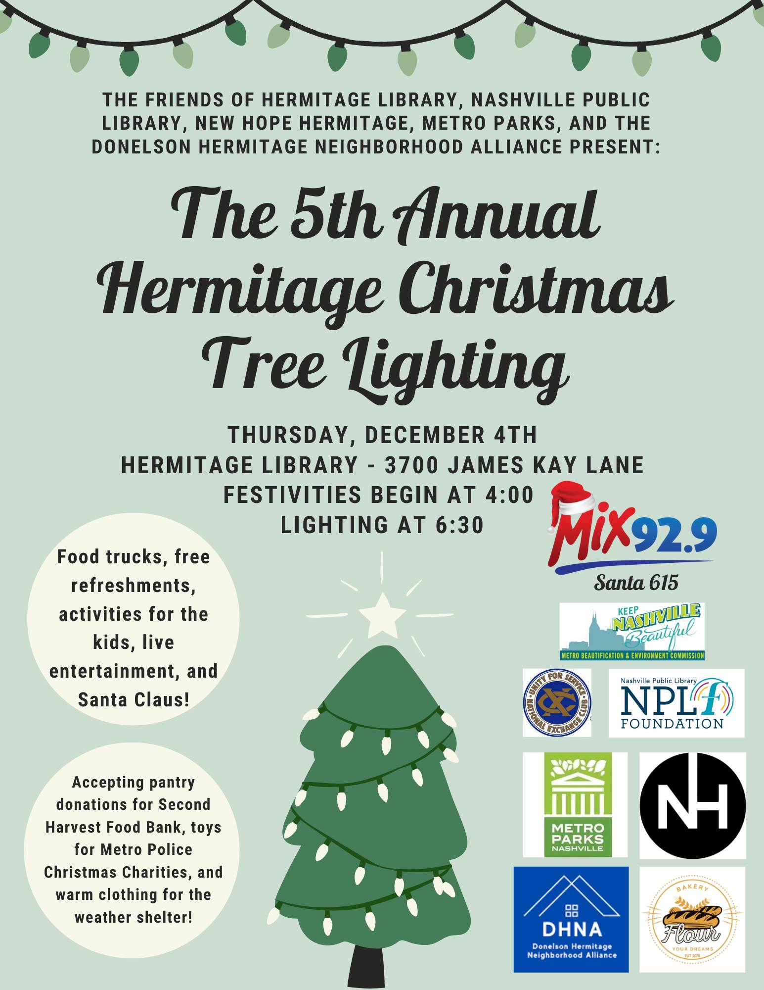 Nashville Public Library - Hermitage - Thursday, December 4th. Festivities begin at 4:00 P.M. Lighting at 6:30 P.M.