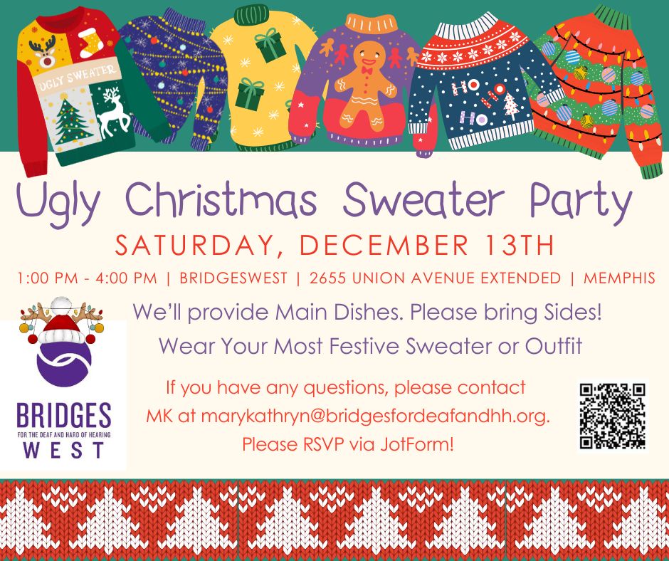 BridgesWEST is ready for some Holiday hijinks! Saturday, December 13th, do your most festive Holiday attire and join us for an Ugly Christmas Sweater Party!