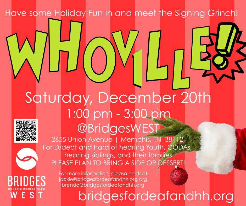 Have some holiday fun in and meet the Singing Grinch! It is for Deaf/deaf and hard of hearing youth, CODAs, hearing siblings, and their families & friends! Please plan to bring a side or dessert!